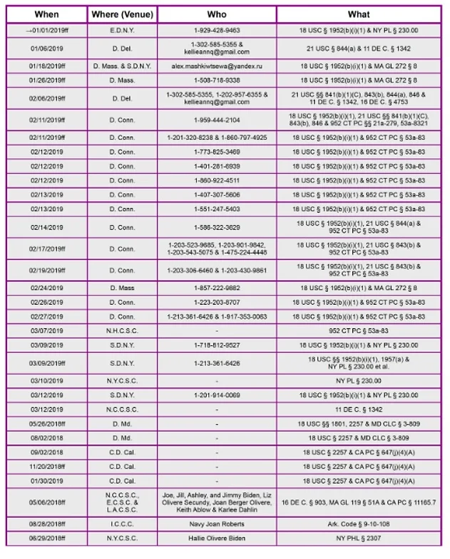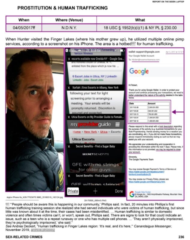 The above are just a few of the crimes documented in the Biden Laptop Report. The Biden family’s sex-related crimes were facilitated by text messaging and other tools which have repeatedly been deemed modes of interstate commerce, as any official “investigation” would reveal. The list of sex-related crimes below is in the order in which they appear in the Report. To access a free copy of the full report, click this link.
