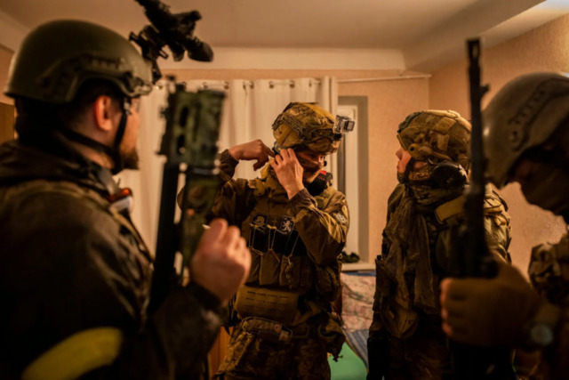 The New York Times described this photo as “Russian volunteer fighters preparing to go on a joint night operation with the Ukrainian Bratstvo battalion.“