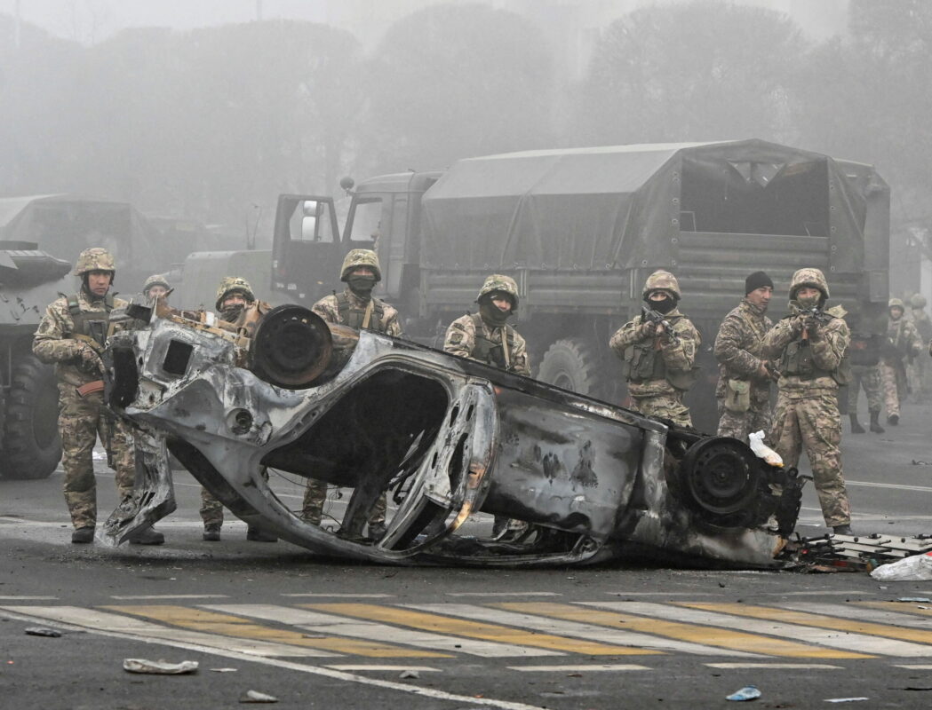 Troops are seen at the main square where hundreds of people were protesting against the government, after authorities' decision to lift price caps on liquefied petroleum gas, in Almaty, Kazakhstan January 6, 2022. REUTERS/Mariya Gordeyeva/File Photo
