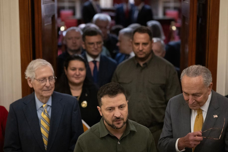 Zelensky, flanked by Senate leaders Mitch McConnell (R-Ky.), left, and Charles E. Schumer (D-N.Y.), exits a meeting at the U.S. Capitol during his last visit to Washington in September. (Tom Brenner for The Washington Post)