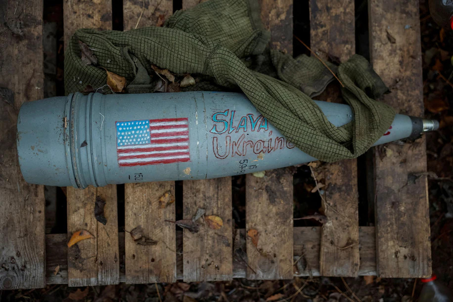 A shell decorated with the American flag is seen at an artillery position in Ukraine's Donetsk region. (Alina Smutko/Reuters)