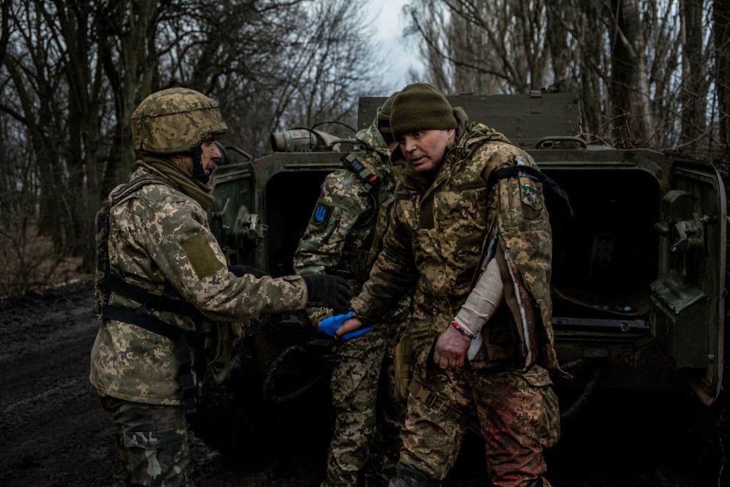 Ukrainian combat medics evacuate a wounded Ukrainian servicem?n from the front line near Bakhmut, on March 8, 2023, amid the Russian invasion of Ukraine. (Photo by Sergey SHESTAK / AFP) (Photo by SERGEY SHESTAK/AFP via Getty Images)