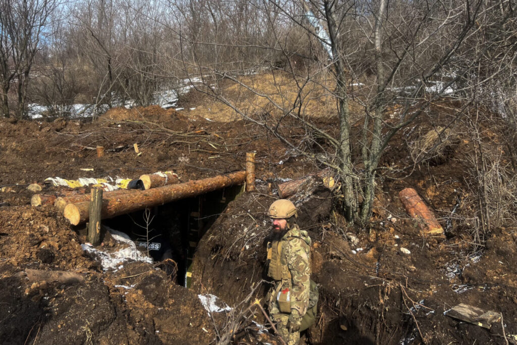 A Ukrainian artilleryman from the 80th Air Assault Brigade goes inside a dugout in an area on the outskirts of Bakhmut in Donetsk Oblast on Feb. 22, 2023. (Asami Terajima/The Kyiv Independent)