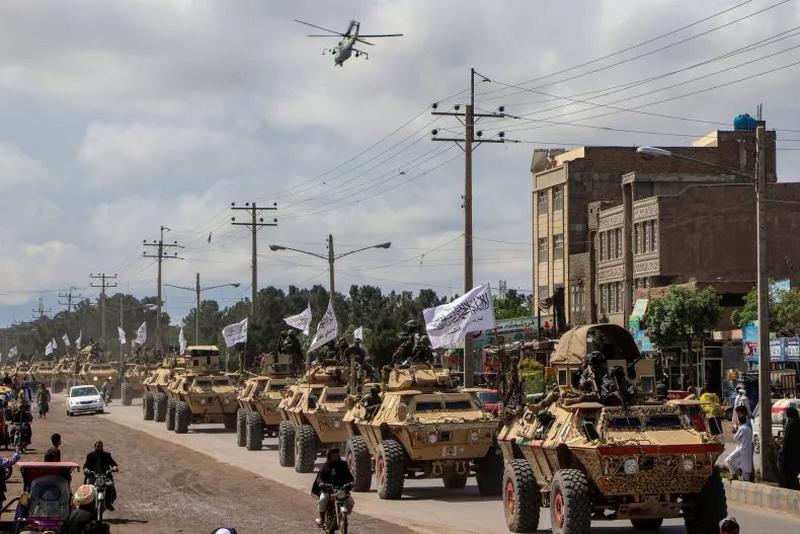 Taliban fighters in armored vehicles supplied by the U.S. army to the collapsed Afghan National Army take part in a military street parade in Herat on April 19. Unlike the Afghan military, the Ukrainian Armed Forces have managed to stave off Russian advances into the capital.