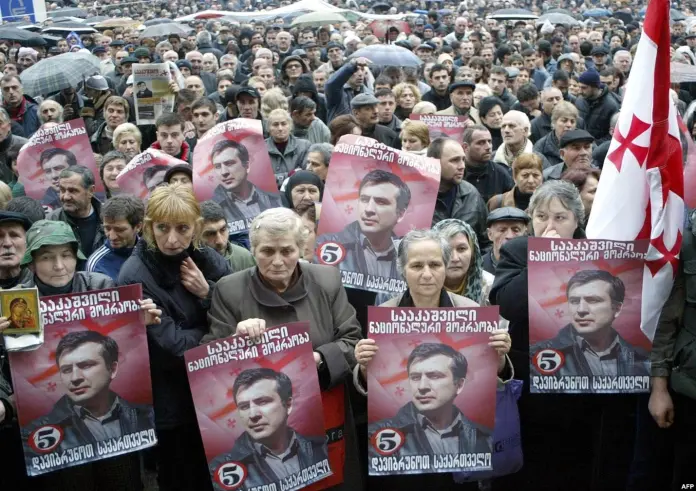 Supporters of Georgia’s 2003 Rose Revolution with posters of Saakashvili. [Source: rferl.org]