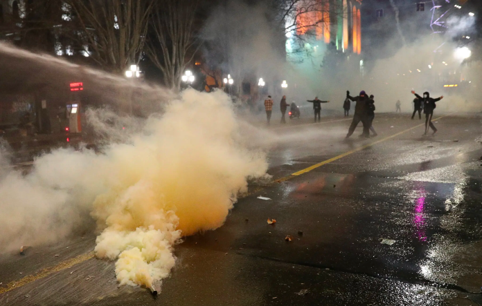 The police used a water cannon and tear gas to disperse protesters against a draft law on “foreign agents” in Tbilisi, Georgia. [Source: nytimes.com]