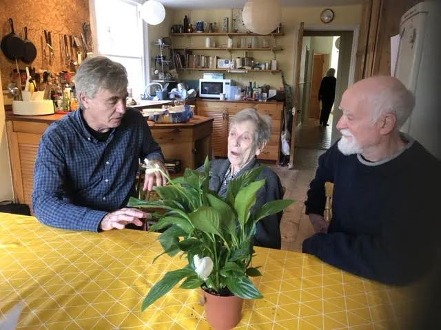 Steve James, Joan Hall, and Dave Lindorff talked at Joan’s home the day after the film showing. During end-of-film comments, Dave said Ted deserved the Nobel Peace Prize posthumously. Coincidentally, photographer Jette Salling had earlier suggested that we present a Peace Lily to Joan at the film showing.