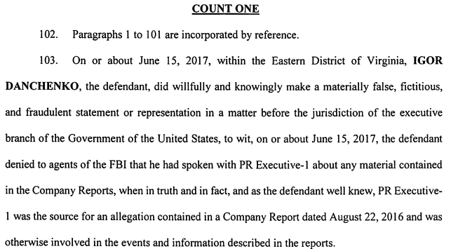 The indictment identifies Danchenko as the author of a great many lies which have been labelled as such. Danchenko was the author, for example, of the Golden Showers story. According to the FBI, the first lie was the one he told agents that he had stayed at the Ritz-Carlton in June of 2016; the truth now revealed is that he stayed there four months later. The story of the Golden Showers had come, Danchenko told the agents, from the general manager of the hotel and other hotel staff. The FBI now confirms that “according to Organizer-1 and PR Executive-1, the staff member did not mention any sexual or salacious activity”.