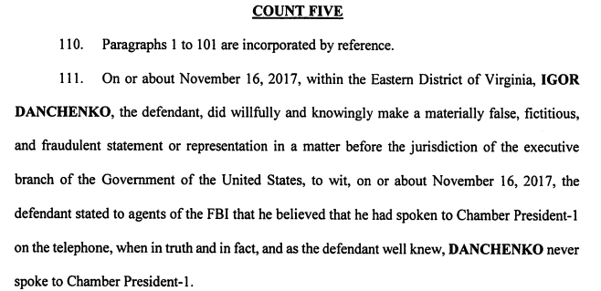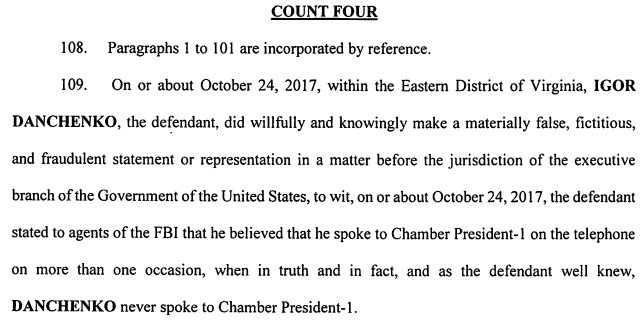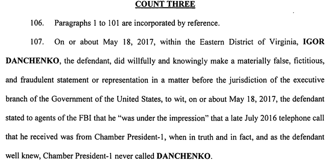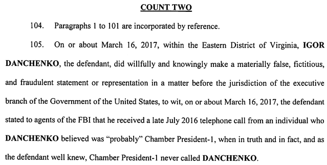 Four of the new criminal counts refer to Sergei Millian (right), whom the indictment calls as “Chamber President-1” because he was at one time the head of the Russian-American Chamber of Commerce. Millian appears in the indictment 75 times. According to the indictment, Danchenko’s crime is saying he had talked to Millian by telephone in July 2016 when there had been no call at all. Danchenko committed four crimes by repeating the same lie to the FBI agents on March 16, 2017, May 18, 2017, October 24, 2017, and November 16, 2017.
