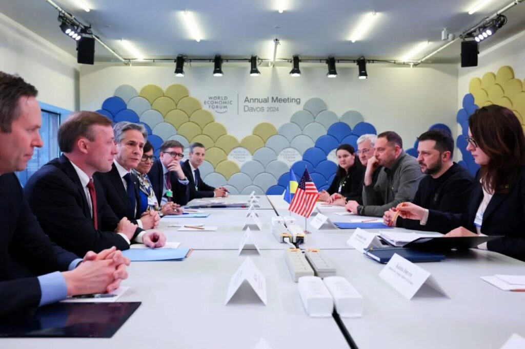 U.S. Secretary of State Antony Blinken and Ukraine’s President Volodymyr Zelenskiy meet during the 54th annual meeting of the World Economic Forum in Davos, Switzerland, January 16, 2024. REUTERS/Denis Balibouse