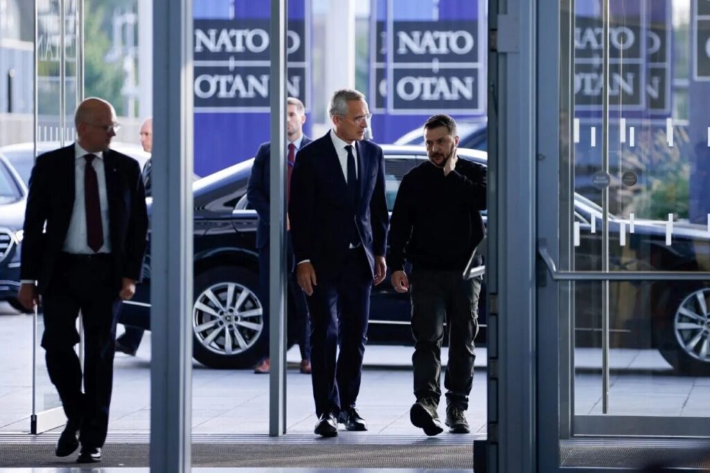 Ukrainian President Volodymyr Zelenskiy and Secretary General of NATO Jens Stoltenberg walk on the day of a NATO Defence Ministers’ meeting at the Alliance’s headquarters in Brussels, Belgium October 11, 2023. REUTERS/Johanna Geron