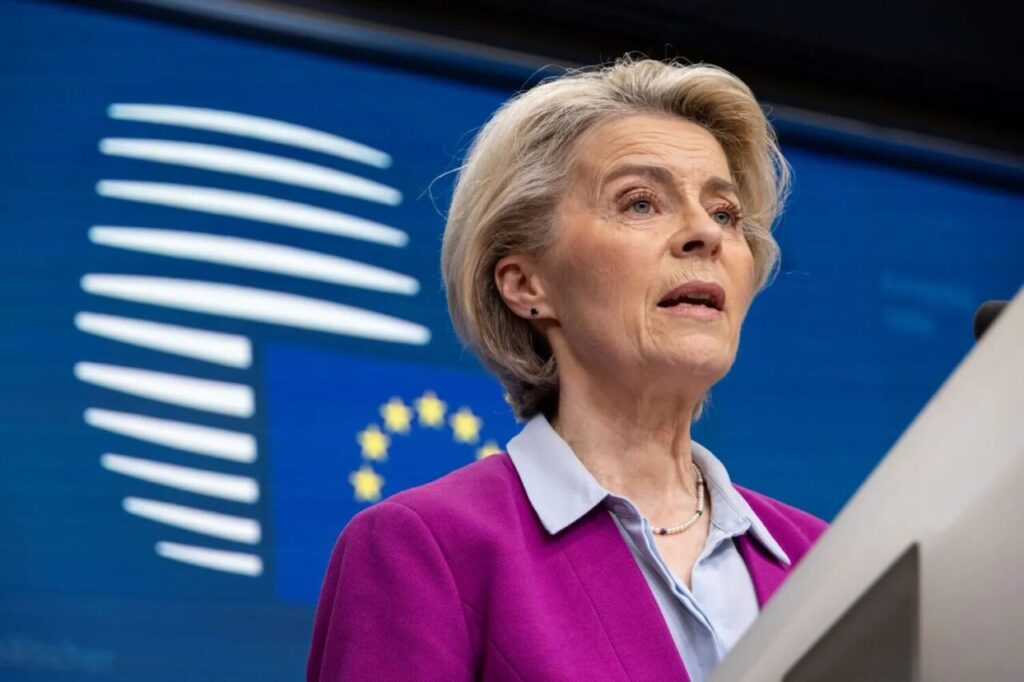 Ursula von der Leyen at a joint press conference briefing with Charles Michel President of the European Council, after the end of the Extraordinary Special European Council Summit, the EU leaders meeting at the headquarters of the European Union. Nicolas Economou/NurPhoto.