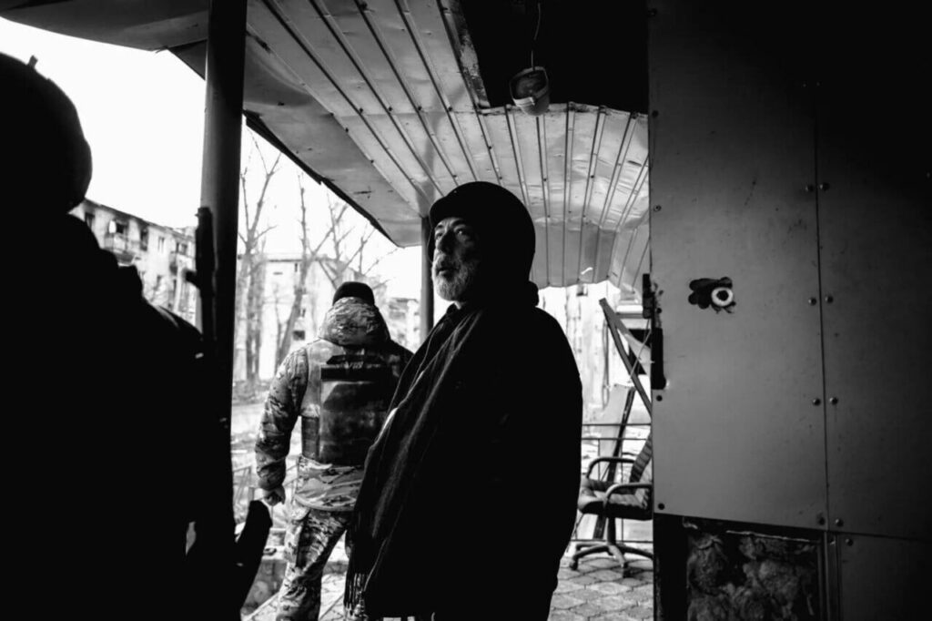 A nearly blind man with his dog explains why he can’t leave: he lives in the same street, and his apartment is still functional – even though he has no water or electricity. He explains how the Ukrainians were occupying each apartment block – with residents turned into refugees or hostages in the basements – and then, pressed by the Russians, relocated to nearby schools and hospitals until finally fleeing.