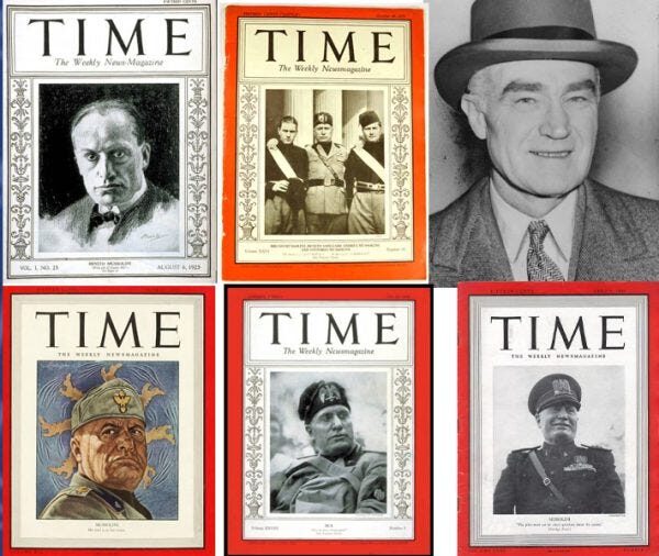 Two years before the Young Plan began, JP Morgan had already given a $100 million loan to Mussolini’s newly established fascist regime in Italy1 — with Democratic Party kingmaker Thomas Lamont playing the role of Prescott Bush in Wall Street’s Italian operation. It wasn’t only JP Morgan who loved Mussolini’s brand of corporate fascism, but Time Magazine’s Henry Luce unapologetically gushed over his decision to put Mussolini on the cover of Time eight times between 1923 and 1943 while relentlessly promoting fascism as the “economic miracle solution for America” (which he also did in his other two magazines Fortune and Life).