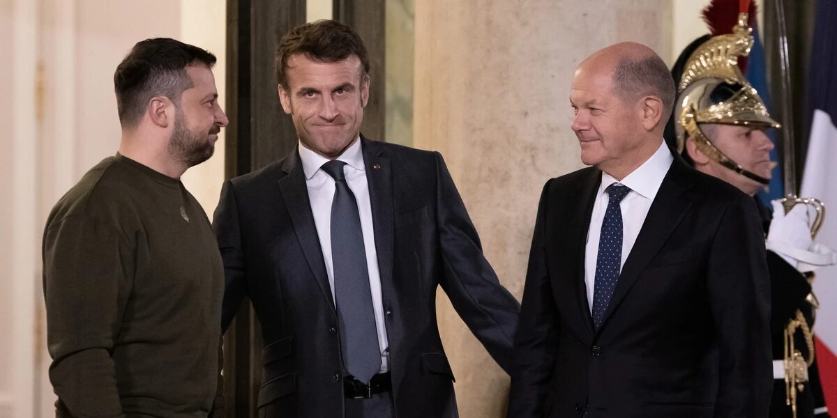 French President Emmanuel Macron welcomes President of Ukraine Volodymyr Zelensky and German Chancelor Olaf Scholz at the Elysée Palace in Paris on Feb. 8, 2023. (Frederic Legrand - COMEO/ Shutterstock)