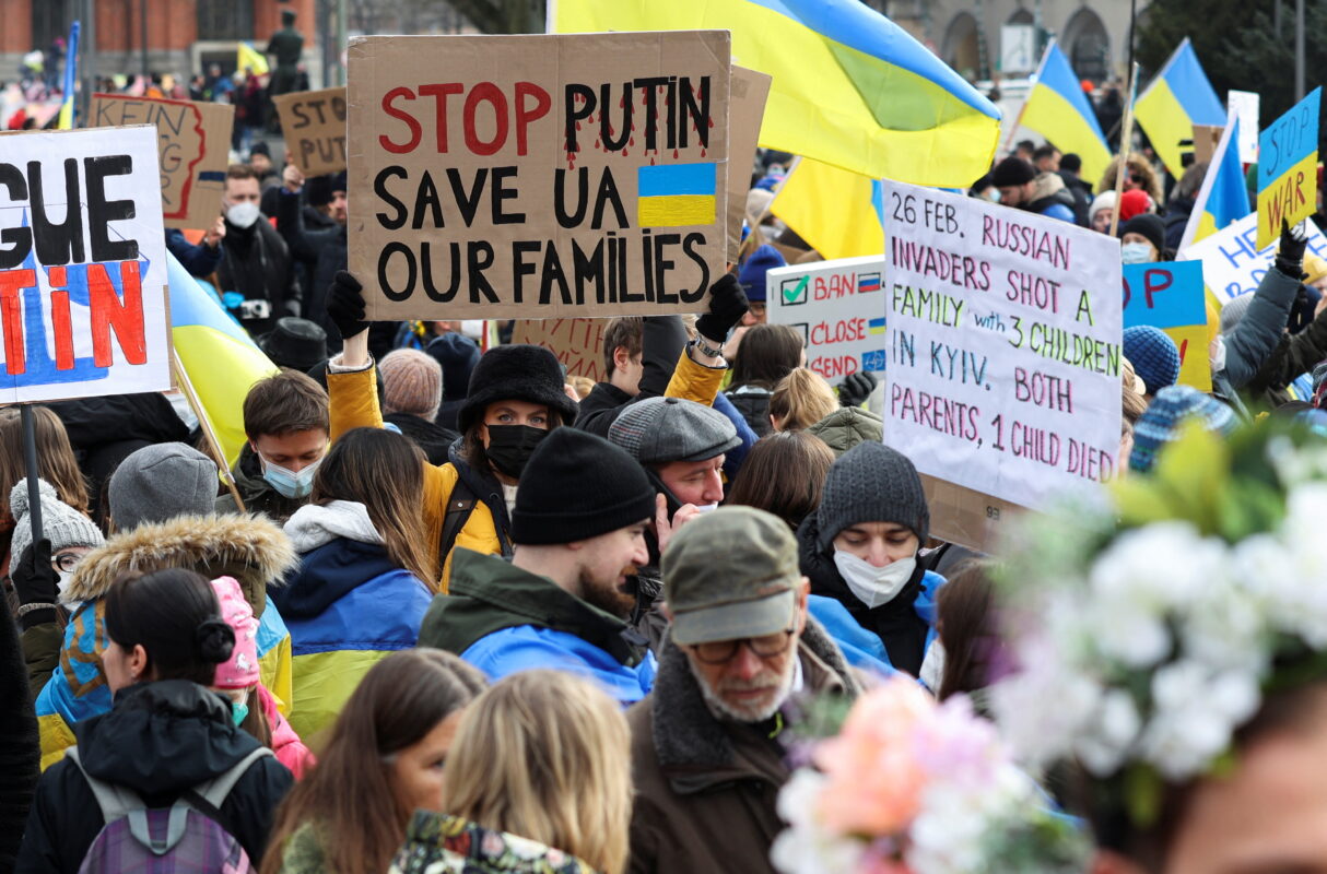 Demonstrators gather during an anti-war protest, after Russia launched a massive military operation against Ukraine, in Berlin, Germany, February 27, 2022. REUTERS/Christian Mang