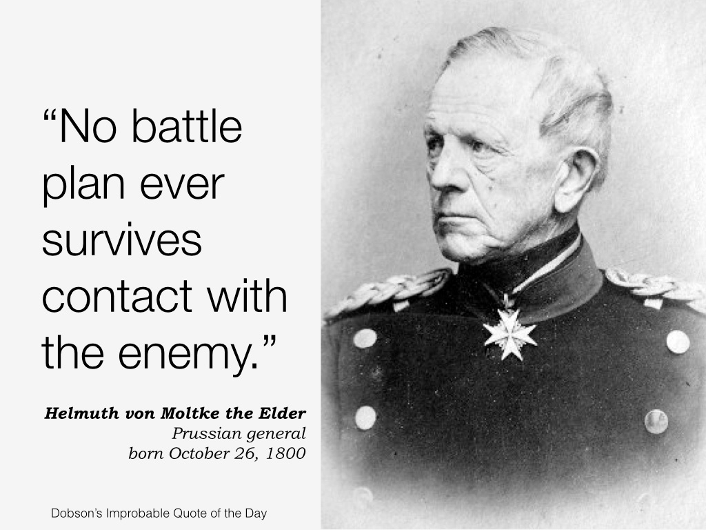 Helmuth von Moltke, a 19th Century German Field Marshall, is credited with the aphorism, “no plan survives contact with the enemy”. The essence of his observation is this — no matter how meticulously you plan a military operation, you must be prepared to adjust on the fly based on what is happening on the battlefield. Planning is a dynamic, not a static set of unit maneuvers and rules of engagement.