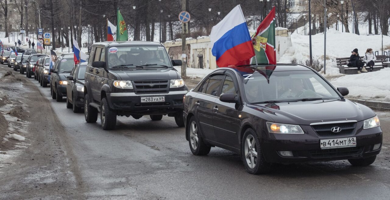 TORZHOK, Russia—More than a hundred cars, many festooned with Russian flags and plastered with stickers proclaiming “For Russia! For Victory!” converged on the main square of this small town in a show of support of President Vladimir Putin and Russia’s military operations in Ukraine.