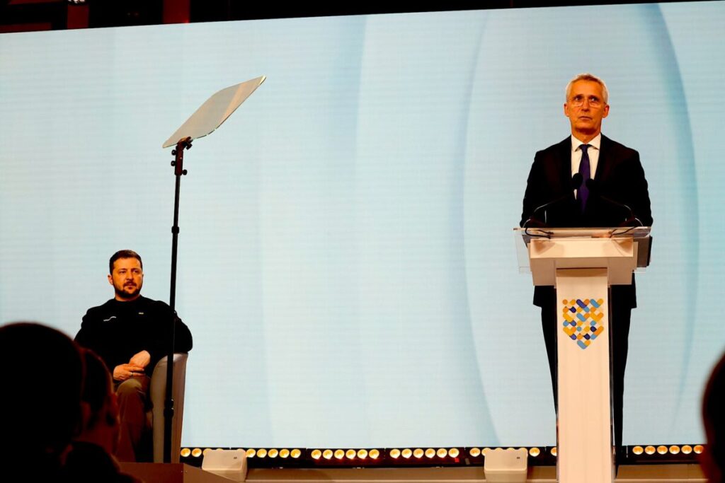 NATO Secretary General Jens Stoltenberg addresses the International Summit of Communities and Regions alongside Zelensky, April 20, 2023. (NATO, Flickr, CC BY-NC-ND 2.0)