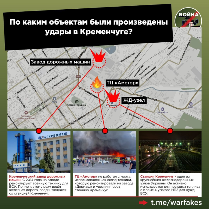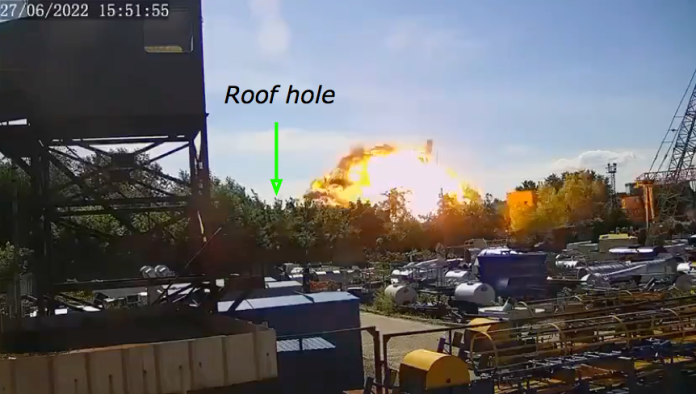 The Donbass Insider reported that the video released by Zelensky on June 29 shows that one of the two missiles launched by Russia hit the railway leading to the factory which are just behind the shopping centre. This is confirmed by satellite images from June 28 showing a crater on the rails that were used to bring in military equipment. This is where the fire most likely spread to the shopping centre.