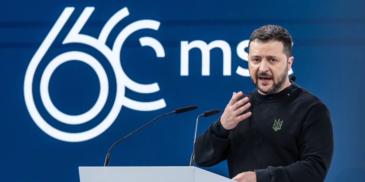 Volodymyr Zelensky speaks at the Munich Security Conference, Feb. 17, 2023. (David Hecker/MSC)