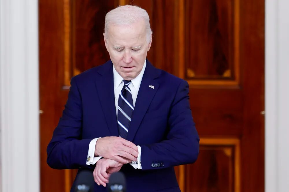 U.S. President Joe Biden looks at his watch as he arrives to give remarks with King of Jordan Abdullah II ibn Al Hussein at the White House on Feb. 12, 2024 in Washington. ANNA MONEYMAKER/GETTY IMAGES