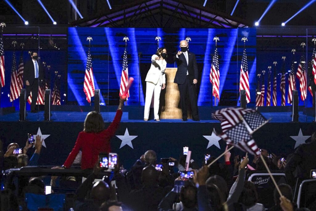 Kamala Harris and Biden celebrating his presidential victory, Wilmington, Delaware, Nov. 7, 2020. (David Lienemann, Biden For President, Flickr, CC BY-NC-SA 2.0)