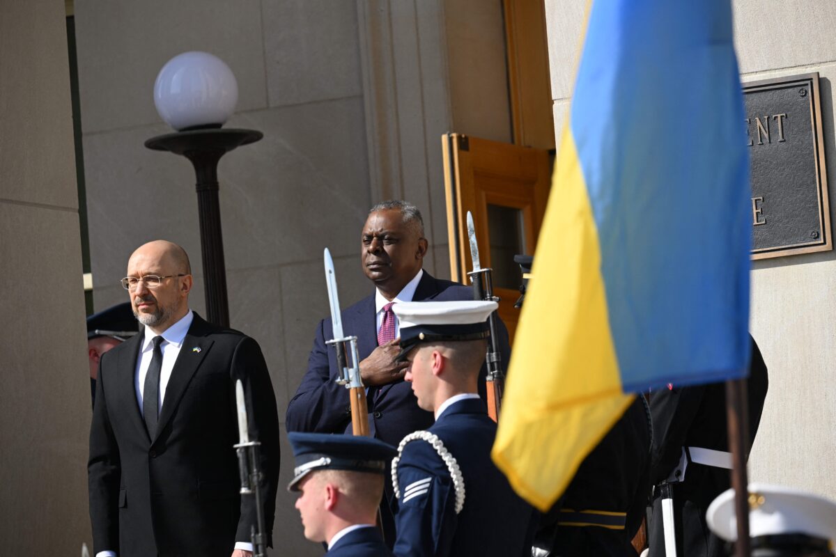 US Defense Secretary Lloyd Austin and Ukrainian Prime Minister Denys Shmyhal at the Pentagon, April 12, 2023. (Photo by MANDEL NGAN/AFP via Getty Images)