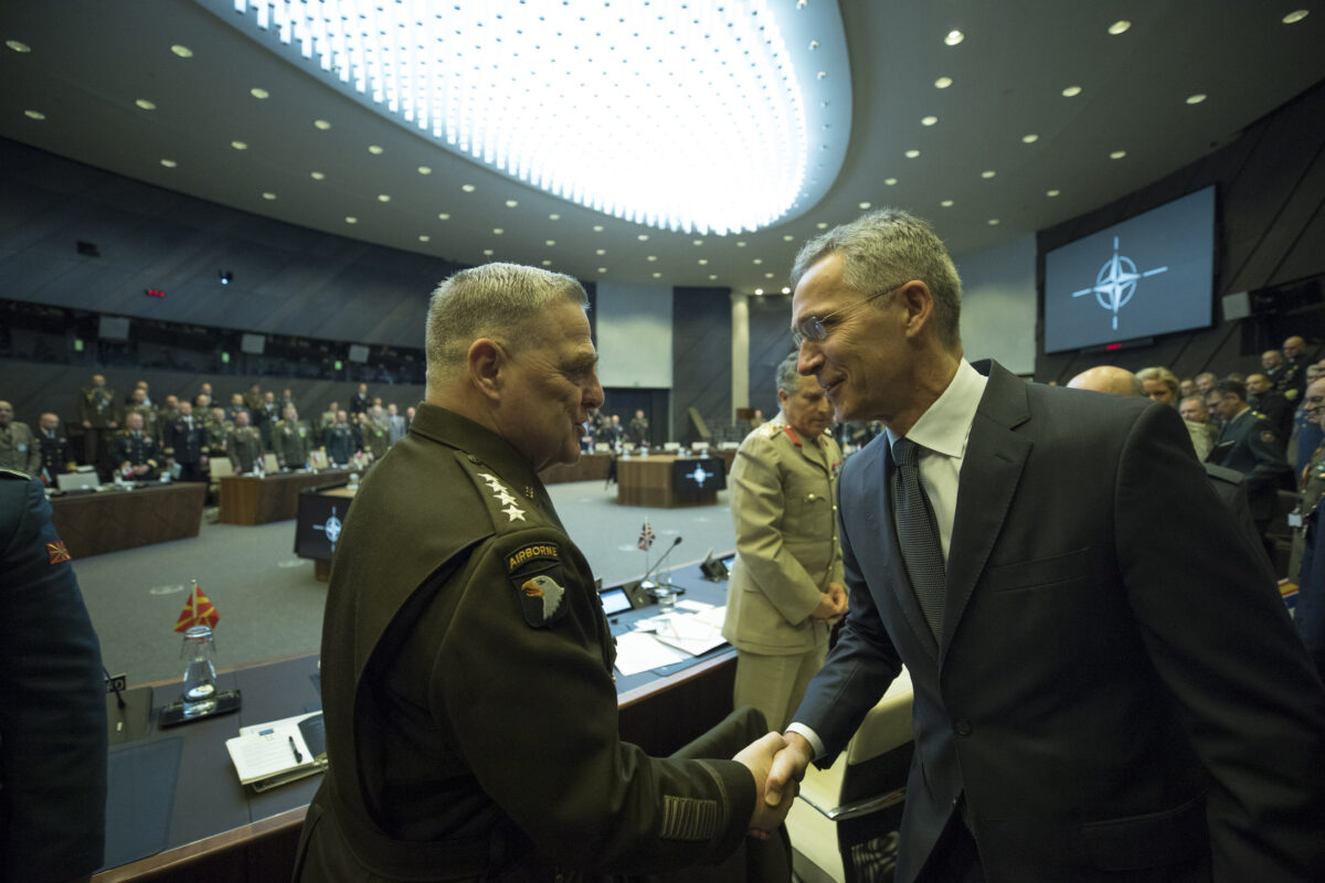 NATO Secretary General, Jens Stoltenberg greeting the Chief of Defence of the United States, General Mark Milley