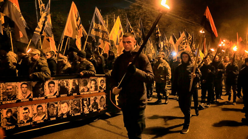 Today, Ukraine has openly Nazi elements within its government, which has passed laws designating World War II-era fascist Ukrainian death squads that perpetrated the Holocaust as heroes and freedom fighters. Every January 1 in Kiev there is a large torchlight march to honor the Nazi collaborator Stepan Bandera, with chants of “Jews out” being very common. There are now hundreds of monuments to fascist collaborators all over the country.