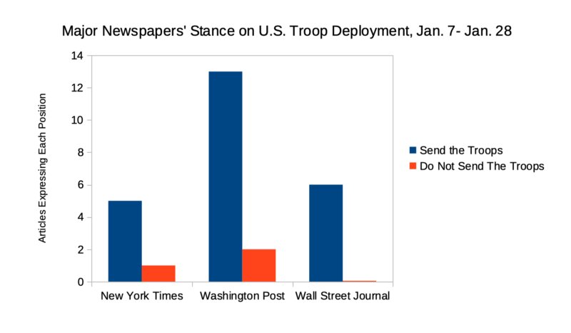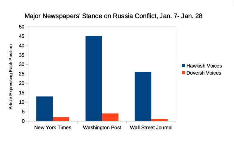 To test Danilov’s claim that Western media have been among the loudest voices cheering for war, MintPress conducted a study of three of the most prominent and influential American outlets: The New York Times, The Washington Post and The Wall Street Journal. Together, these three outlets often set the agenda for the rest of the media system, and could be said to be a reasonable representation of the corporate media spectrum as a whole. Using the search term “Ukraine” in the Factiva global news database, all opinion pieces on the conflict published in the previous three weeks (Jan. 7 – Jan. 28) were read and studied. This gave a sample of 91 articles in total; 15 in the Times, 49 in the Post and 27 in the Journal. For full information and coding, see the attached viewable spreadsheet.