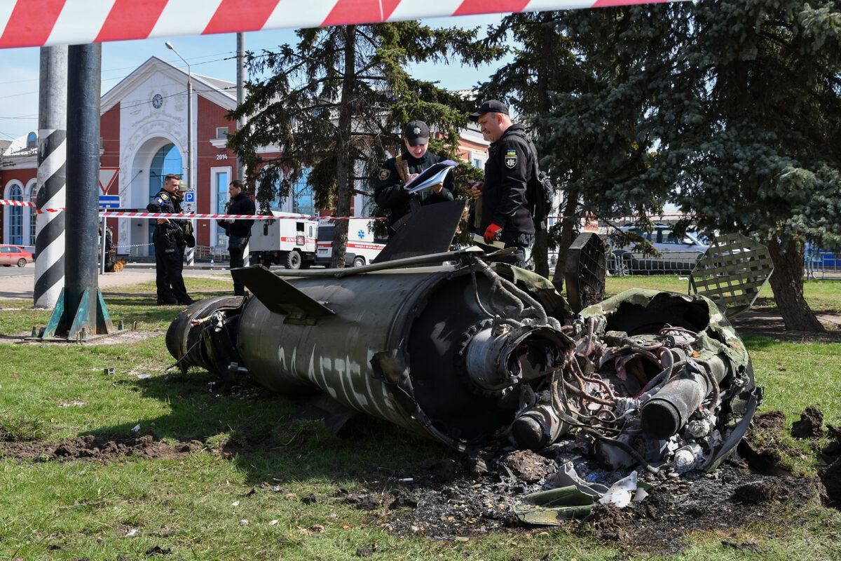 Ukrainian servicemen stand next to fragments of a missile outside the railway station in Kramatorsk, Ukraine, on Friday, April 8. (Andriy Andriyenko/AP)