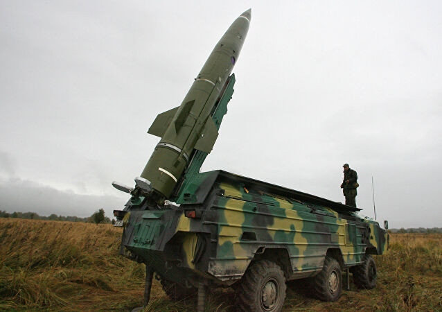 The Tochka missile, below in a firing position, consists of a rocket engine, four fins and grids to direct its course, a solid fuel compartment and a warhead at its front. A complete missile weighs about 2,000 kilogram.