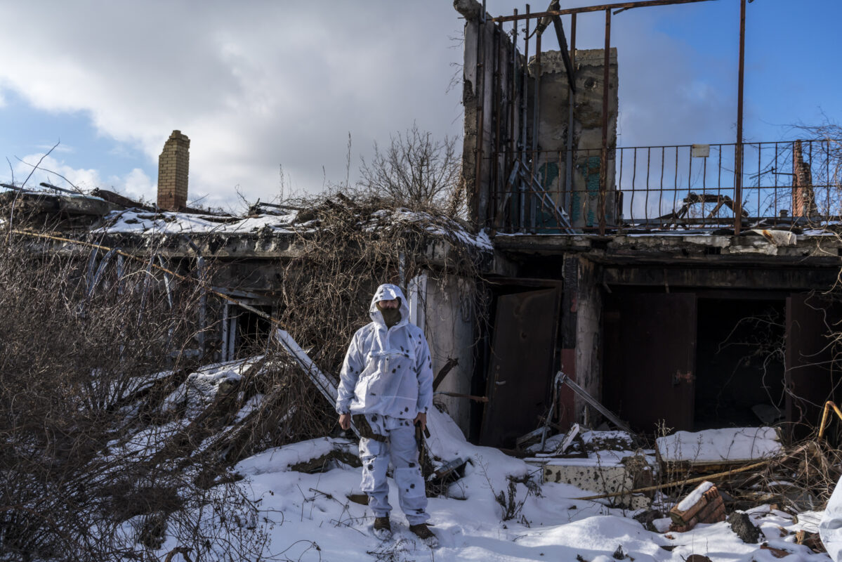 A Ukrainian soldier stands on the front line in Pisky, Ukraine on January 18. Russia has amassed around 130,000 troops on the border with Ukraine.