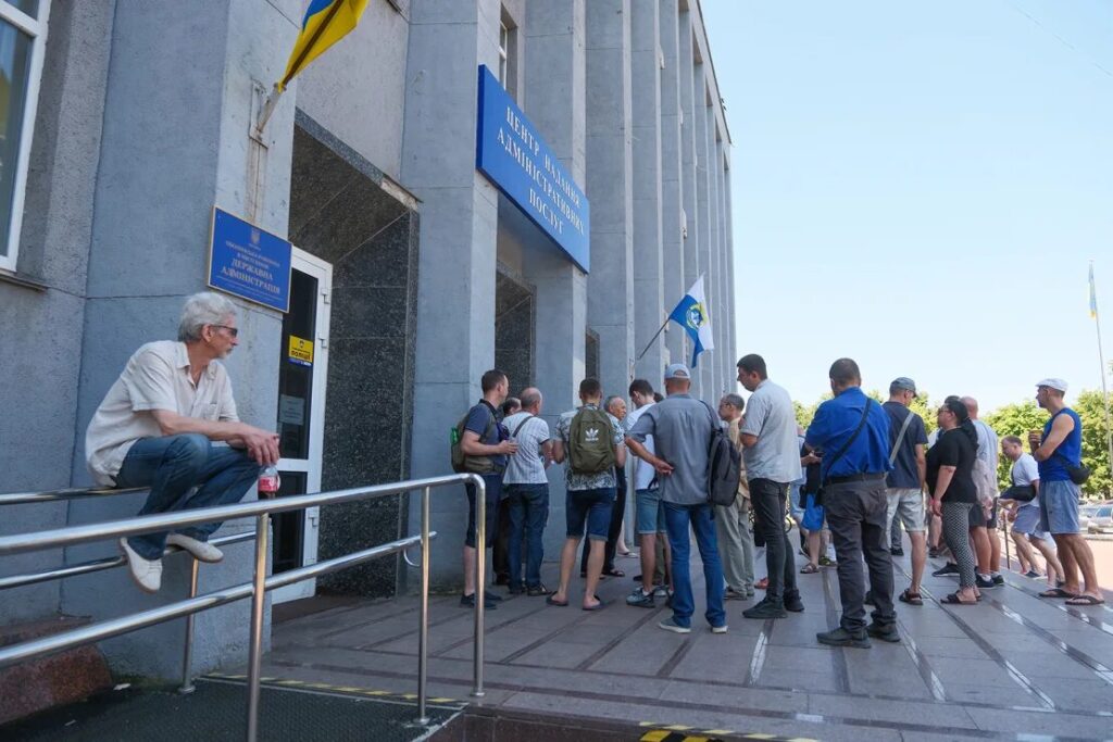 Ukrainian conscripts wait in lines outside the Administrative Services Center to update their registration data on July 12, 2024 in Kyiv, Ukraine. Vitalii Nosach/Global Images Ukraine/Getty Images