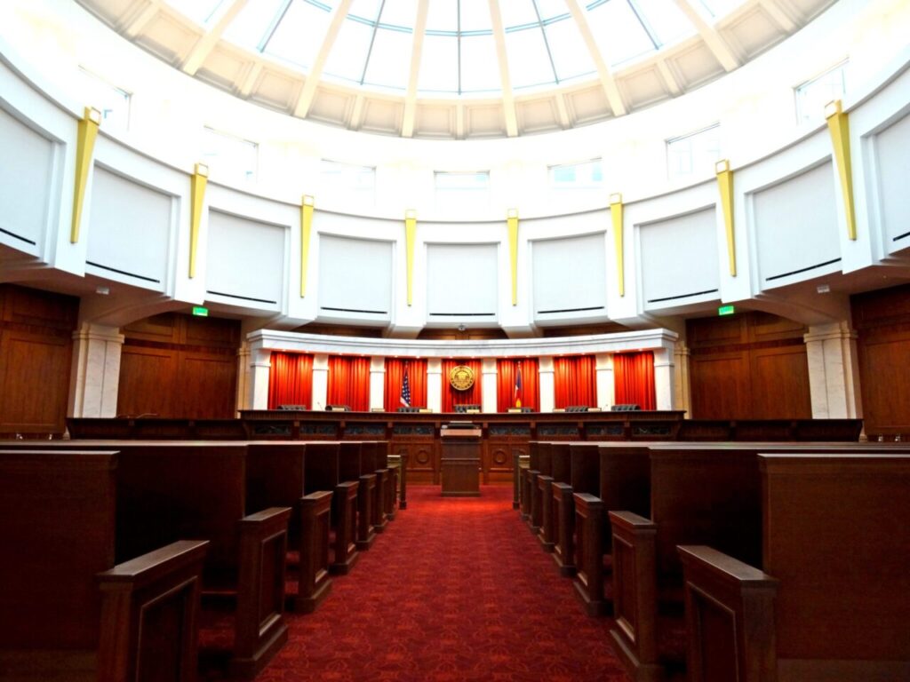 Courtroom of the Colorado Supreme Court in the Ralph L. Carr Colorado Judicial Center in Denver. (Jeffrey Beall, Wikimedia Commons, CC BY 3.0)