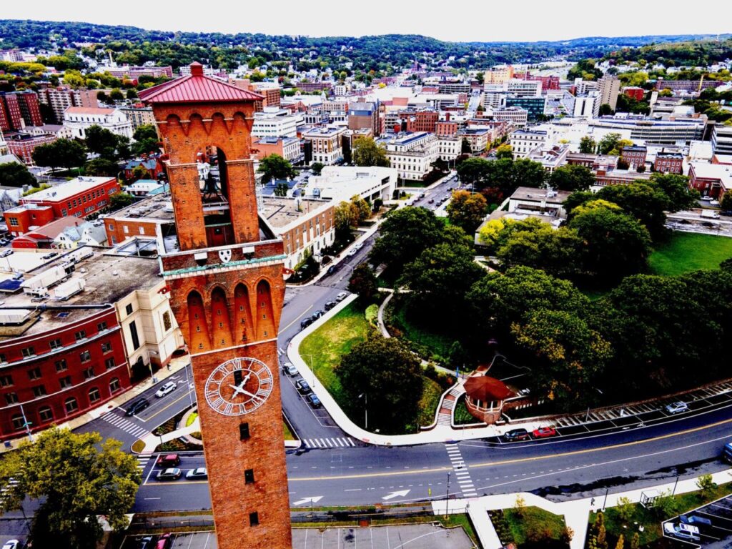 The Waterbury Union Station clock tower is in Waterbury, Connecticut, 2022. (TRexEditorNJ, Wikimedia Commons, CC BY-SA 4.0)
