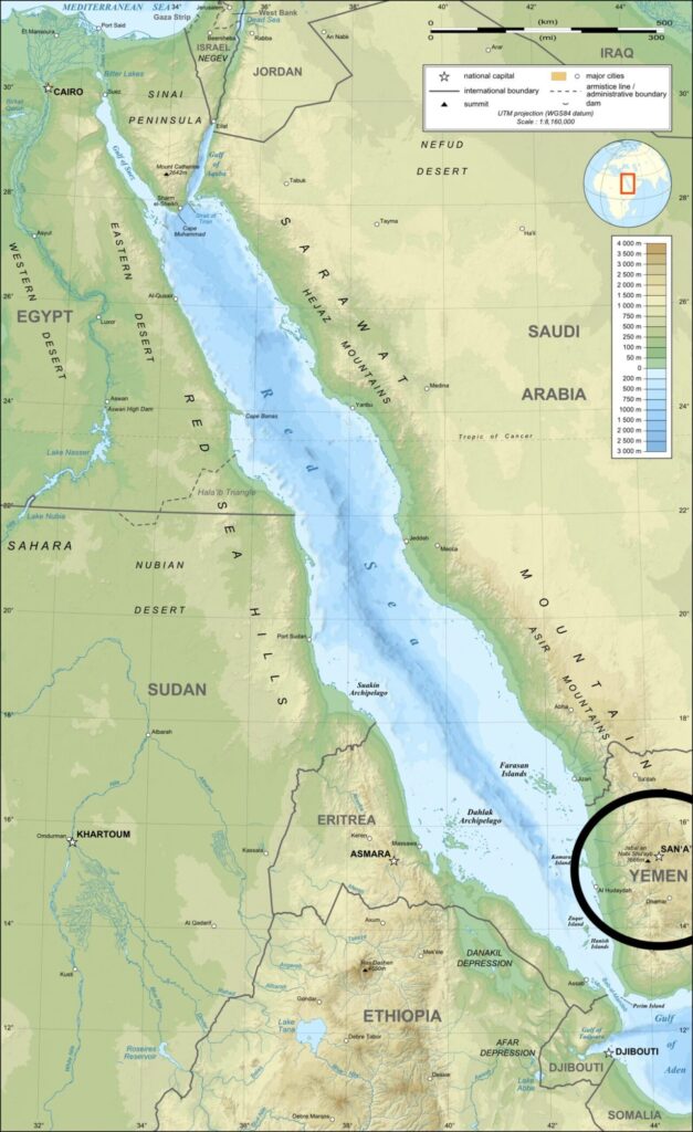 The first of these concerns what the Biden regime calls Operation Prosperity Guardian. The Pentagon described this last week as a coalition of 20–odd countries that have agreed to assist the U.S. to protect commercial traffic in the Red Sea from drone attacks mounted by Houthi rebels in Yemen, which — look at the map — chokes off the southern end of this key maritime passage.