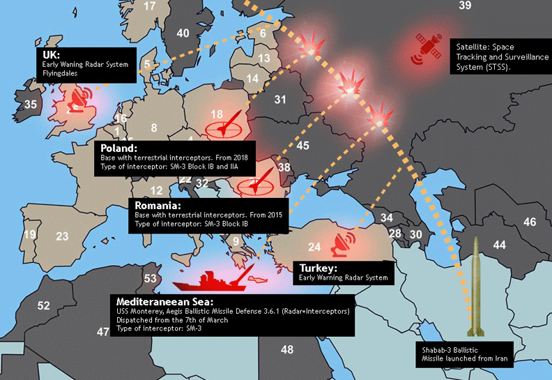 The map does not show the deployment of US Navy nuclear-armed Tomahawk missiles off the Russian coast, in the Black Sea. The warheads for these weapons and vessels are stocked at the Rota naval base in Spain, according to open sources; they may be secretly stored at the Souda Bay naval base in Crete, Greece, following ratification of a new Greek defence agreement with the US in May of this year.