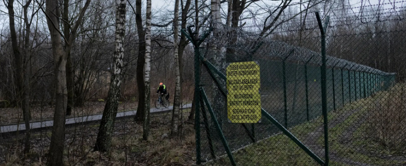 The base perimeter at the Redzikowo forest in February. The Keep Out sign is in Polish, English, German and Russian. Loudspeakers along the perimeter broadcast “The Star-Spangled Banner” every day.