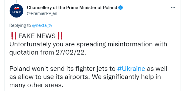 Blinken had announced “we are working with Poland as we speak to see if we can backfill anything that they provide to the Ukrainians.”