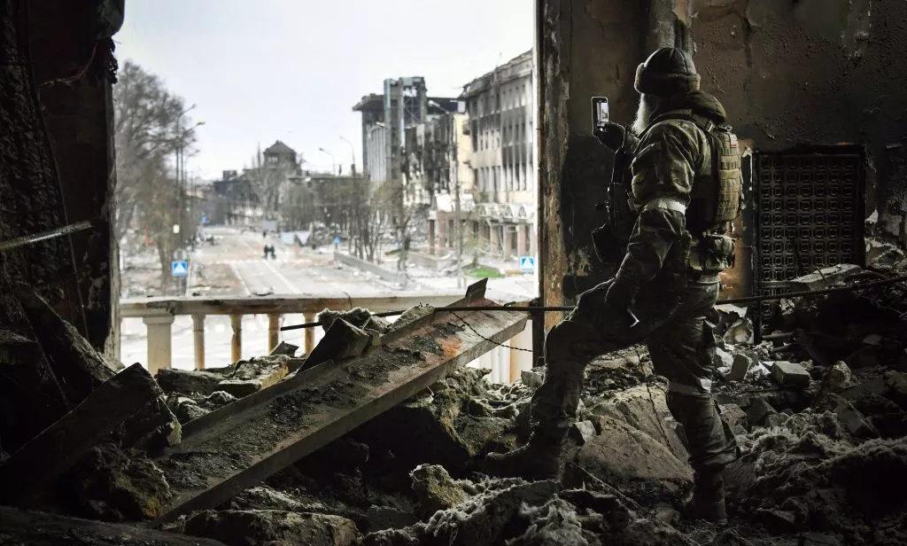 A Russian soldier patrols the Mariupol drama theatre on April 12, 2022 in Mariupol. The theater was destroyed by an airstrike, which reportedly killed 600 civilians that were hiding inside. (Alexander Nemenov/AFP via Getty Images)