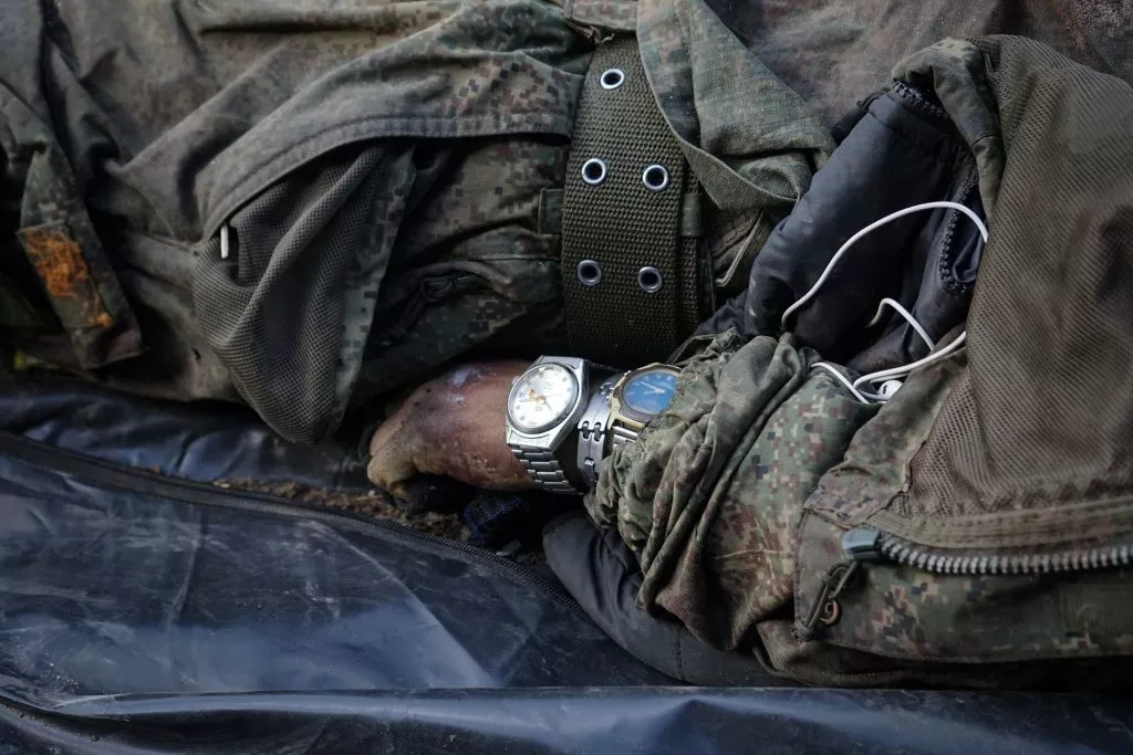 Several watches are seen on hand of a dead Russian soldier in Kharkiv on May 14, 2022. (Ivan Chernichkin/Zaborona/Global Images Ukraine via Getty Images)