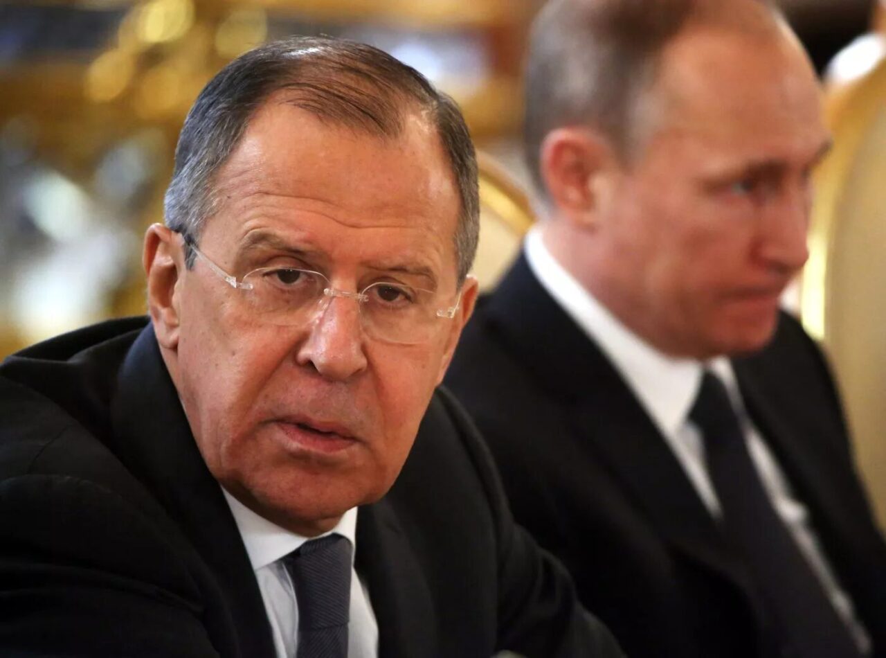 Russian Foreign Minister Sergei Lavrov, left, and President Vladimir Putin, right, attend talks at the Grand Kremlin Palace in Moscow on April 5, 2017. Lavrov has issued a warning to the West over the planned delivery of F-16 fighter jets to Ukraine from Belgium. MIKHAIL SVETLOV/GETTY IMAGES