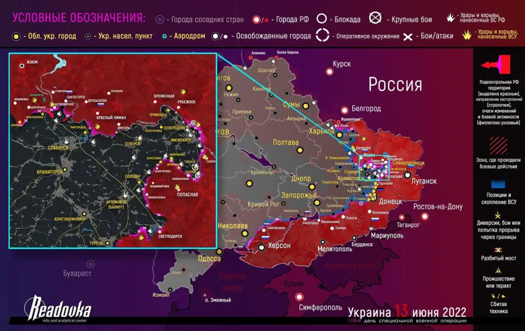 The map’s area in pink and gray display the regions Lenin gave to the new Ukraine SSR in 1922 and the Crimea which Khrushchev handed Kiev in 1954, respectively. It is no coincidence that it was Crimea in 2014 and the Donbass regions of Luhansk and Donetsk in Ukraine’s far east in 2014 and that it is the remainder of those regions’ territories plus Kharkiv in the north and Zaporozhia, Kherson, Nikolaev, and Odessa now that have been at the spearhead of Putin’s military moves in Ukraine. The war map as of June 12 shows Russian forces (red-colored portion of the map) having occupied much of the very same pink area (‘Novorossiya’), adding to plus gray shaded Crimea annexed in 2014. The red areas of Russian-occupied territory include all of the the pink and gray areas incorporated into Ukraine by Lenin in 1922 and Khrushchev in 1954 except for Kharkov (Kharkiv) in the northeast, Nikolaev, where Russian have entered but not moved deep into the region, and Odessa, which is rumored to be on Putin’s target list should Zelenskiy continue to reject peace talks.
