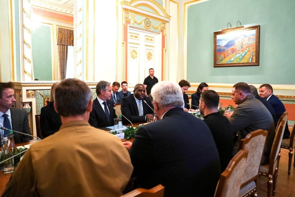 Blinken and Lammy, on left side of table, meeting with Ukraine’s President Volodymyr Zelensky on Tuesday. (Ben Dance / FCDO, Flickr, CC BY 2.0)