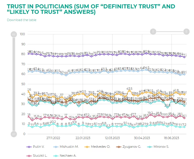 The VTsIOM measurement of distrust of domestic politicians found that the publicity generated by Prigozhin during the Battle of Bakhmut and then during the mutiny caused a negative 2.5 percentage point rise against the Minister of Defense, Sergei Shoigu; this is less than the margin of polling error.