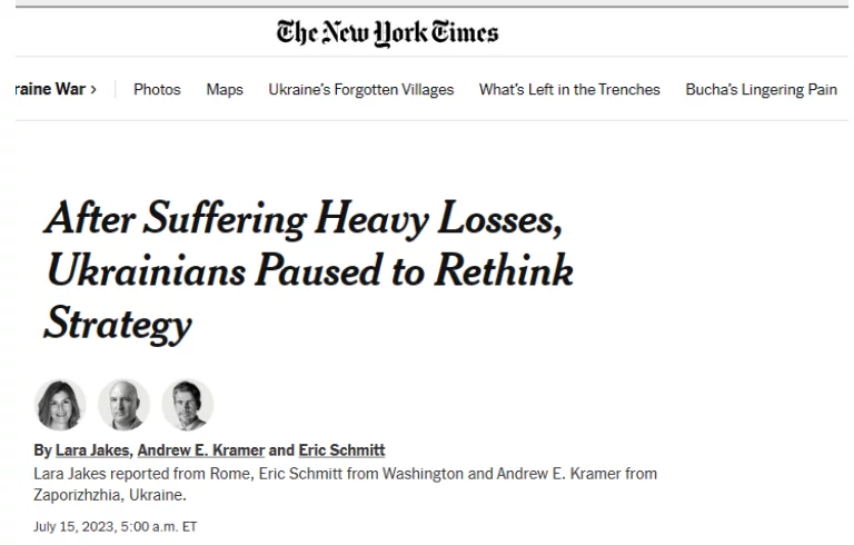 “It is within the realm of possibility that Ukrainian forces have seen losses at this level,” the New York Times quotes a British security analys[8]t, adding that “ a significant level of lost weapons was generally a hallmark of wars of attrition, like the one in Ukraine.” The newspaper adds the claim: “In the first two weeks of Ukraine’s gruelling counteroffensive, as much as 20 percent of the weaponry it sent to the battlefield was damaged or destroyed, according to American and European officials. The toll includes some of the formidable Western fighting machines — tanks and armored personnel carriers — the Ukrainians were counting on to beat back the Russians. The startling rate of losses dropped to about 10 percent in the ensuing weeks, the officials said, preserving more of the troops and machines needed for the major offensive push that the Ukrainians say is still to come. Some of the improvement came because Ukraine changed tactics, focusing more on wearing down the Russian forces with artillery and long-range missiles than charging into enemy minefields and fire. But that good news obscures some grim realities. The losses have also slowed because the counteroffensive itself has slowed — and even halted in places — as Ukrainian soldiers struggle against Russia’s formidable defences. And despite the losses, the Ukrainians have so far taken just five of the 60 miles they hope to cover to reach the sea in the south and split the Russian forces in two.”