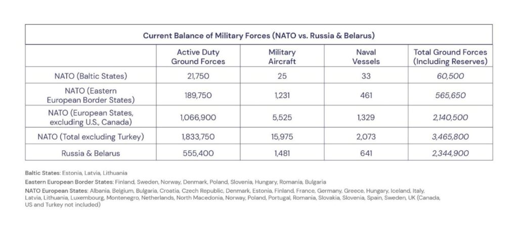 NATO has a greater than 3:1 advantage over Russia in active-duty ground forces and naval vessels and a 10:1 advantage in warplanes. Further, the economic capacity of the NATO alliance to sustain an extended war dwarfs that of Russia.