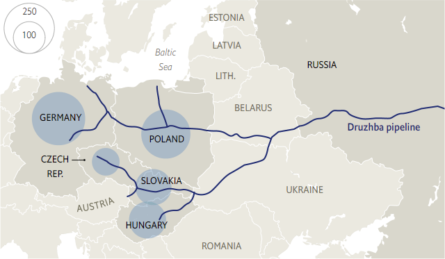 Crude oil imports from Russia to EU countries supplied via Druzhba pipeline